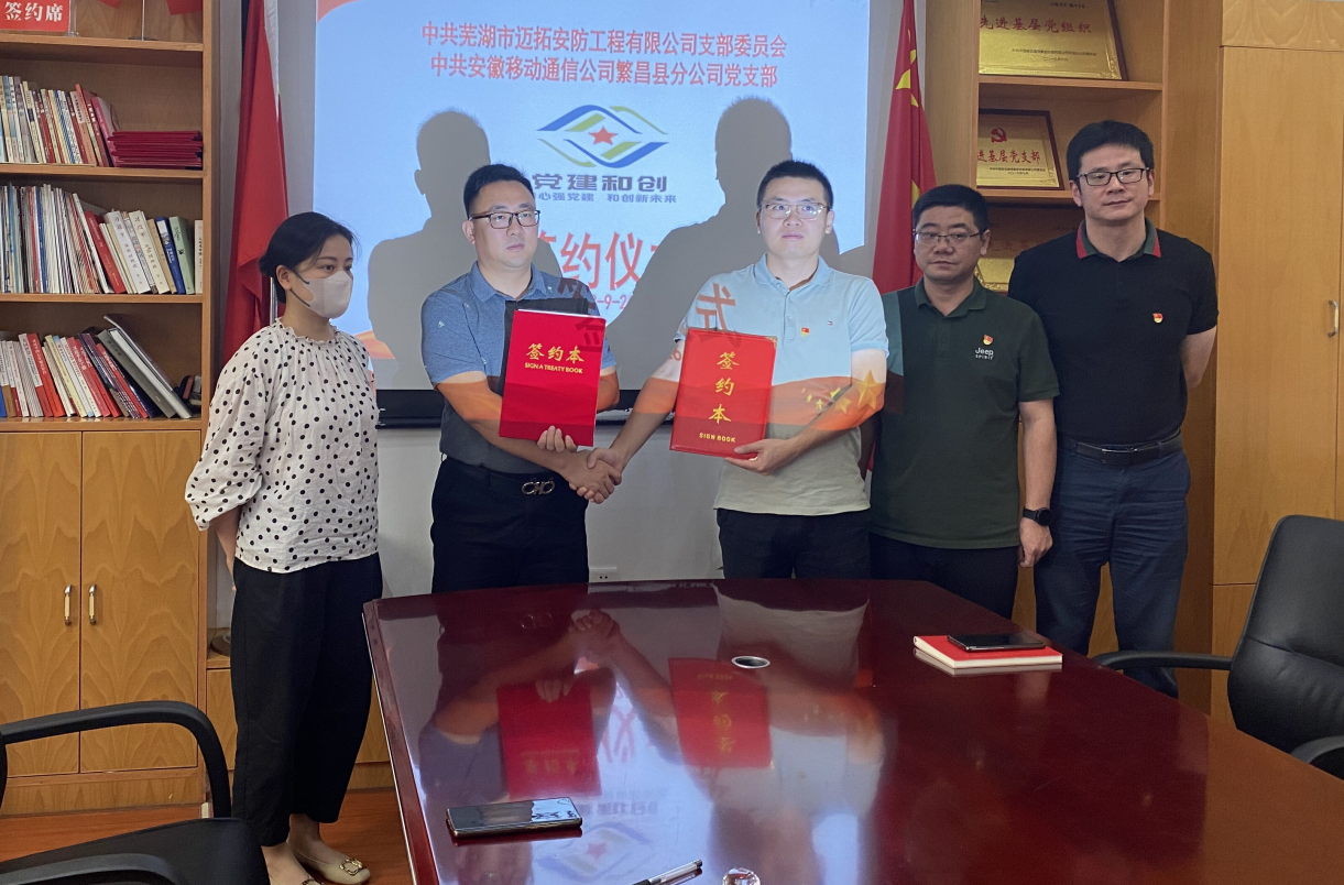 为深入学习贯彻党的二十大精神,落实新时代党的建设总要求,推动党建工作与业务发展深度融合,近日,芜湖市迈拓安防工程有限公司党支部与安徽移动通信公司繁昌县分公司党支部隆重举行“党建和创”签约仪式,双方党员代表及企业负责人共同见证这一重要时刻,正式开启“党建共建、资源共享、发展共促”的崭新合作篇章。 签约仪式前,移动公司党支部带领与会人员参观了其党建文化展示墙与数字化技术展厅,详细介绍了在党建引领下的5G通信、云安全、物联网等技术研发与应用成果;迈拓安防党支部则分享了在安防场景落地、应急处置服务等领域的实践经验,为双方精准合作奠定基础。 座谈会上,双方围绕“理论同学、组织同建、服务同行、成效同享”核心方向展开深入交流,一致认为基层党组织的政治优势可转化为企业发展优势。在全体党员见证下,双方党支部书记共同签署《“党建和创”合作协议》,明确将建立常态化合作机制:联合开展党课学习与红色教育活动,强化党员思想引领;组建“党员技术攻坚队”,聚焦智慧安防、远程监控、数据安全等关键领域开展技术研发;共同开展社区安防宣讲、应急演练等志愿服务,延伸服务群众的触角。 县移动公司党支部书记表示,将充分发挥央企技术与资源优势,为迈拓安防注入数字化动能;迈拓安防党支部书记则强调,将以共建为契机,推动安防服务与数字技术深度融合。此次签约既是基层党组织互学互鉴的创新实践,更是政企协同赋能产业升级的生动探索,未来双方将以高质量党建引领安防领域数智化发展,为社会安全保障贡献红色力量。